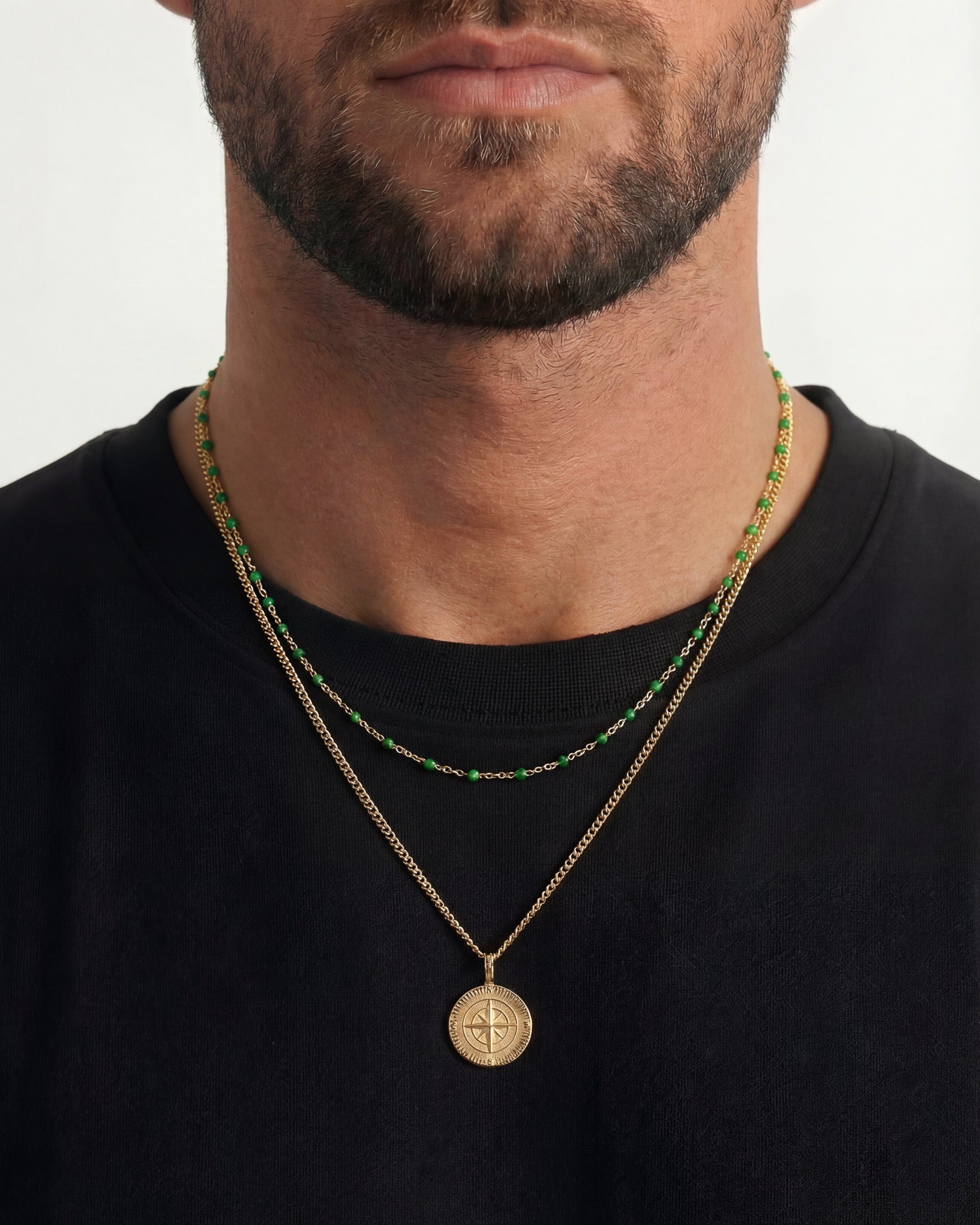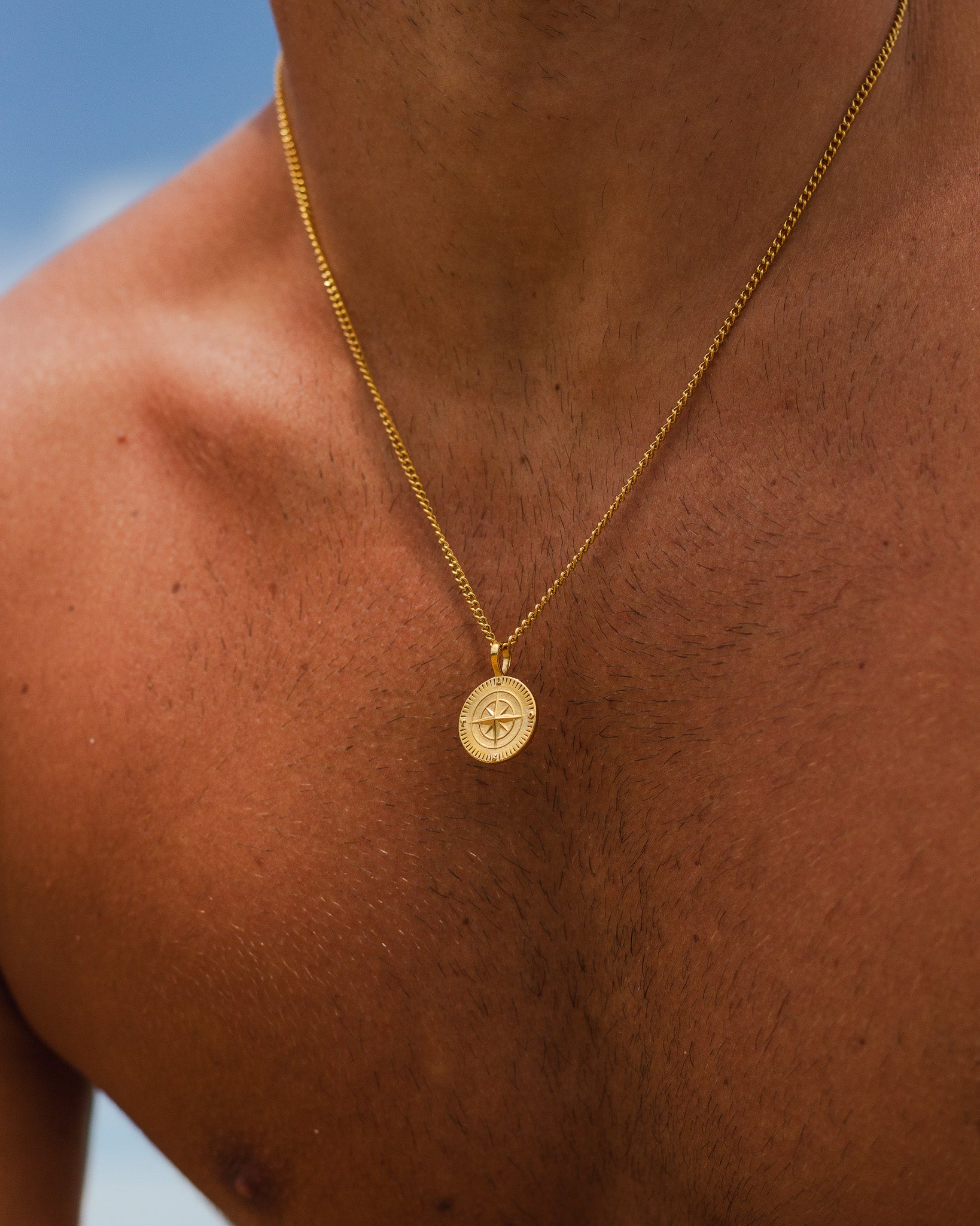 Featuring a classic compass pendant, this gold necklace blends modern luxury with timeless adventure.